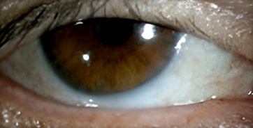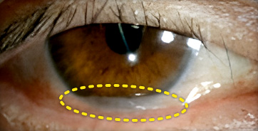 결막에 멜라닌 색소가 침착되어 갈색 반점이 나타나는 것을 의미합니다.