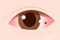 결막에 멜라닌 색소가 침착되어 갈색 반점이 나타나는 것을 의미합니다.